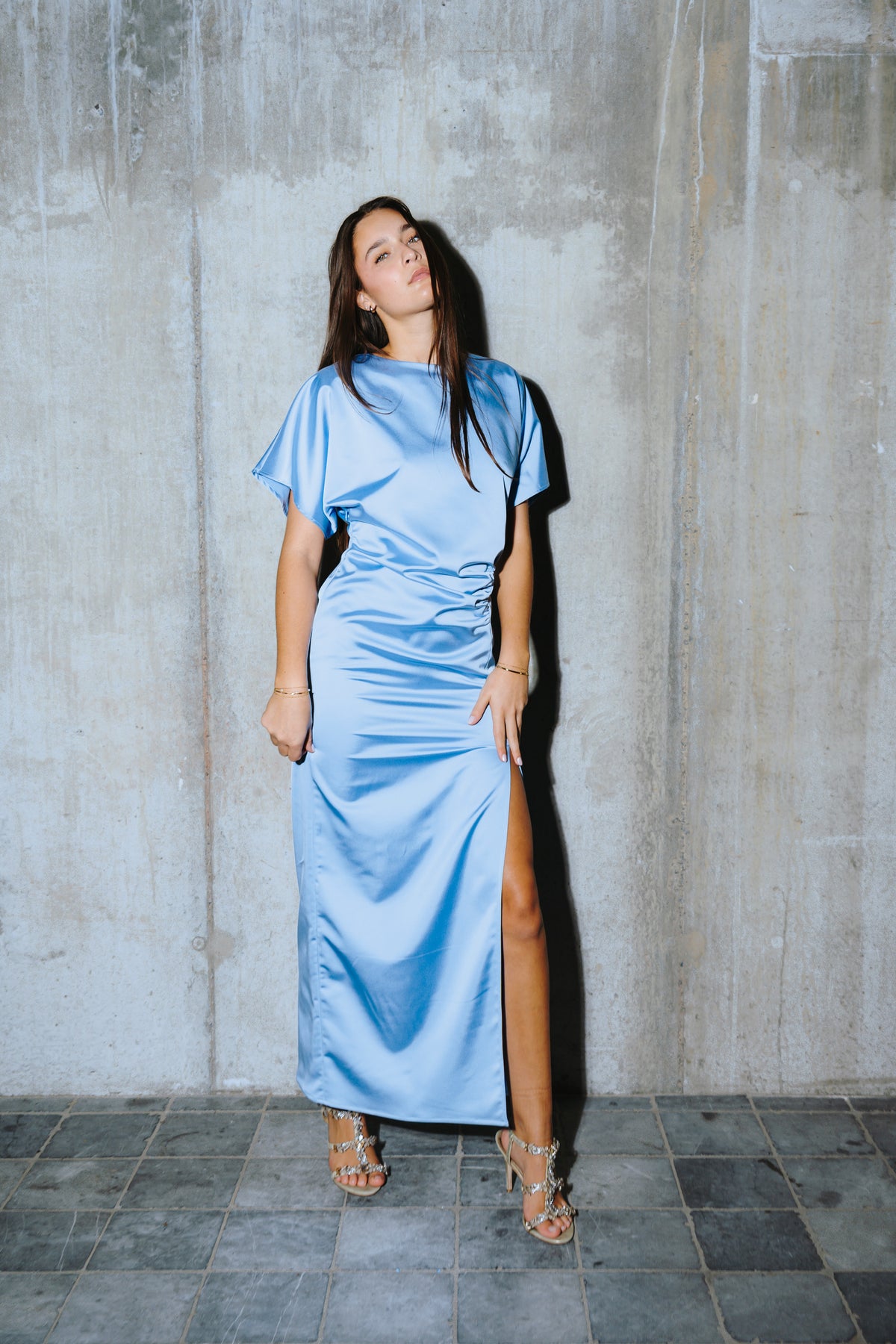 Elegant and modern with a refined silhouette. This light blue satin midi dress drapes softly along the body and highlights the waist with a subtle gathered detail. The short sleeve design balances the sleek skirt, while the side slit adds movement and elegance. A timeless choice for graduations, weddings, and sophisticated evening events.
