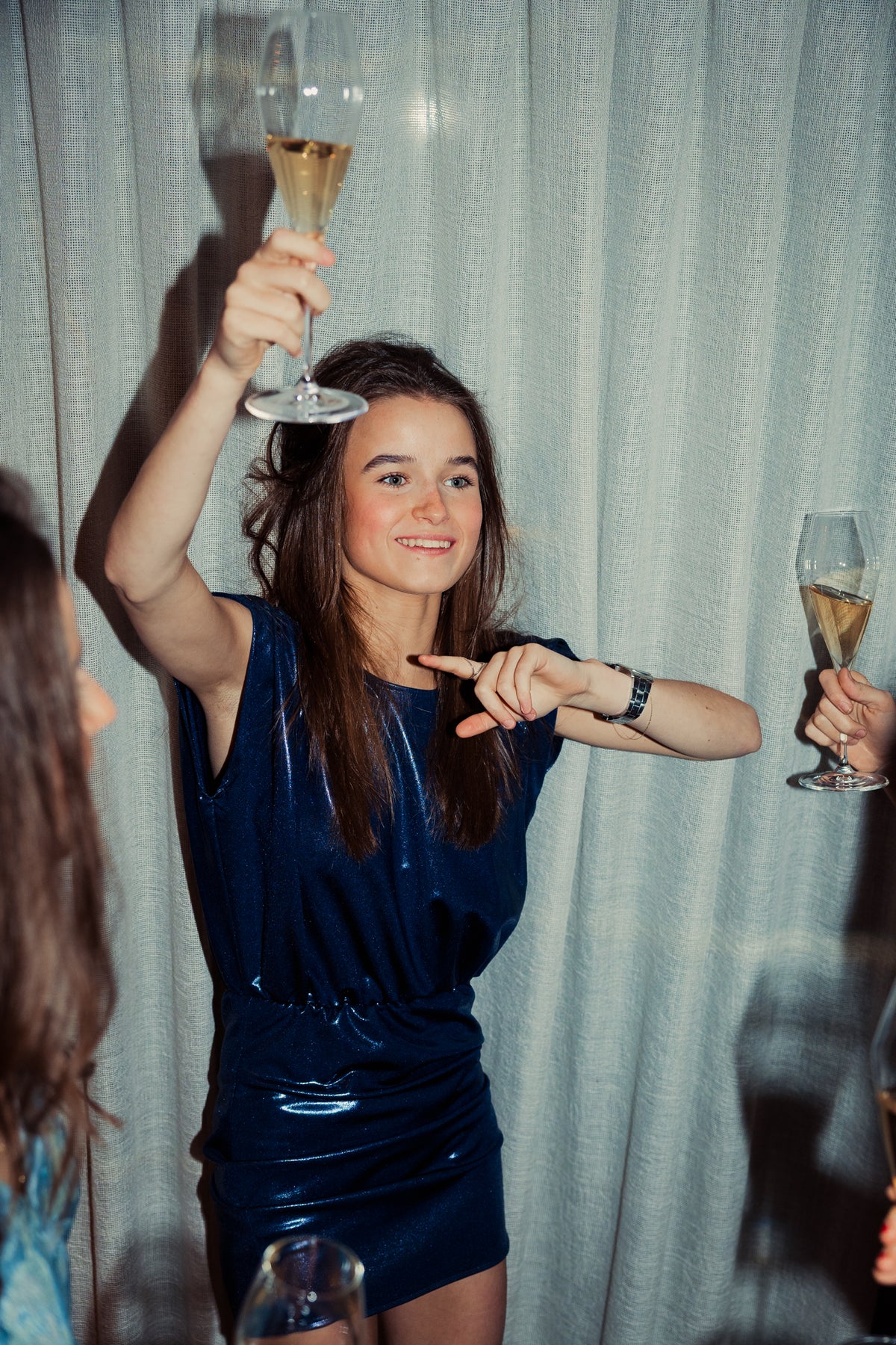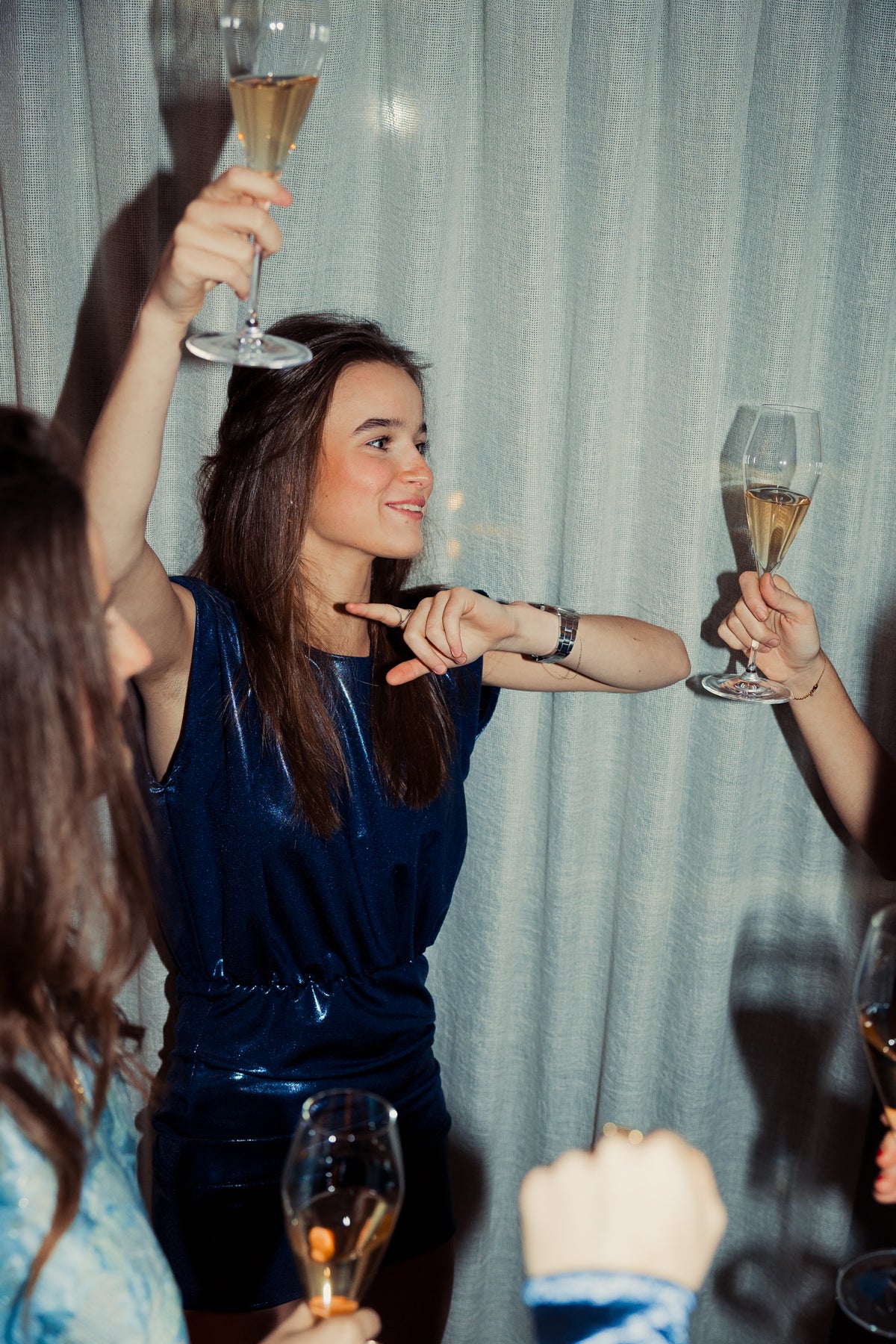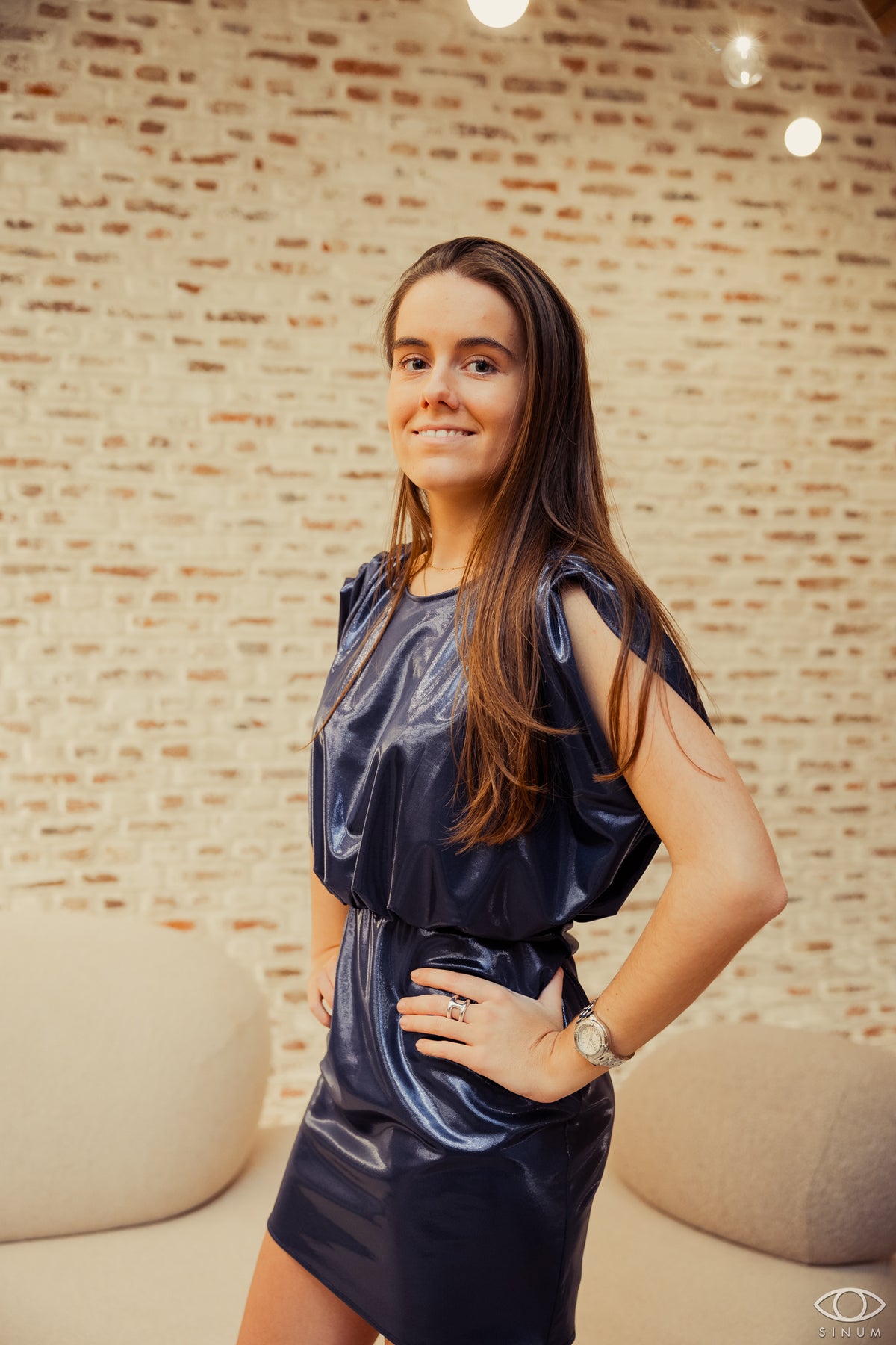 The relaxed top and elastic waist offer comfort all night, while the shoulder detail gives structure and edge. The metallic blue fabric reflects light with every move, making this mini dress perfect for parties, celebrations, and late-night plans.