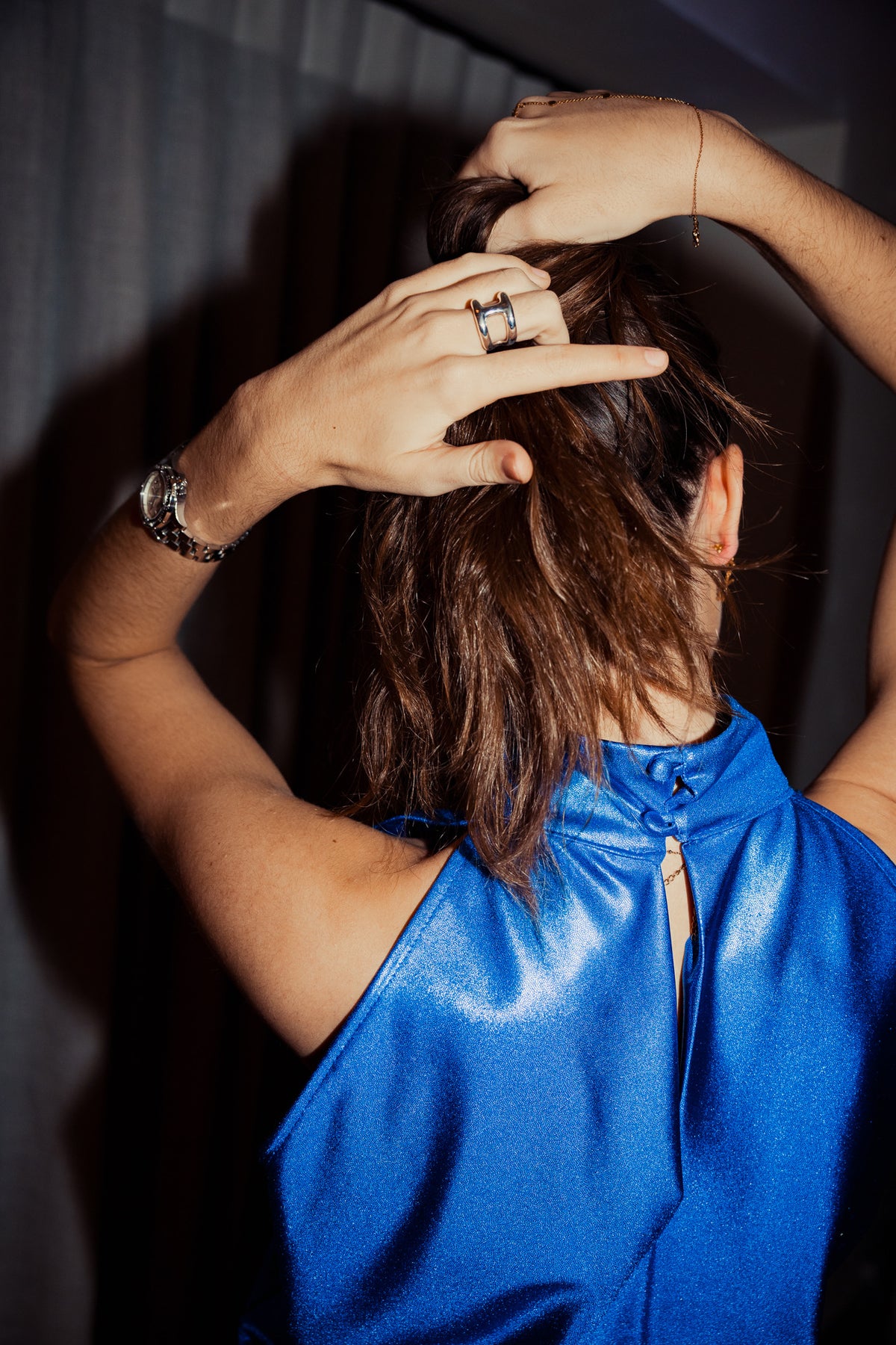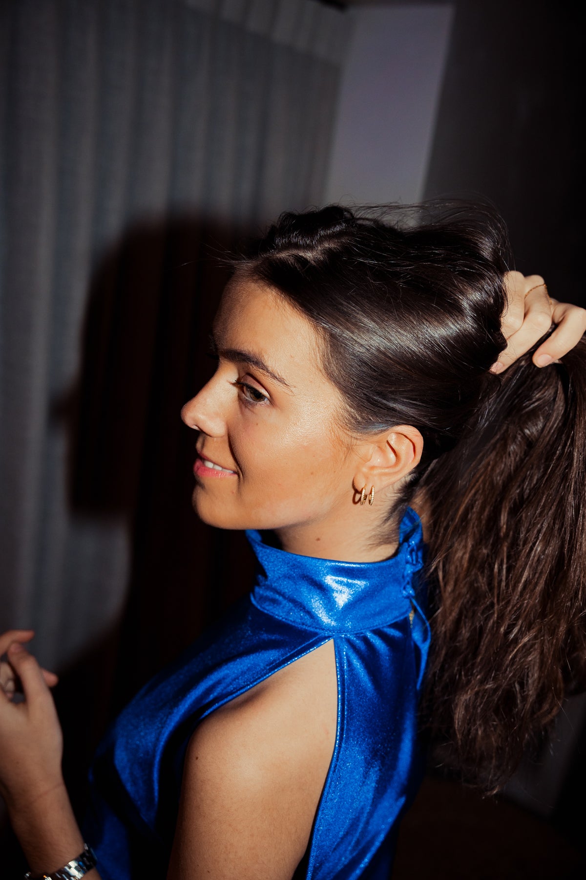 This blue metallic halter top is made for nights where you want control and impact. The American neckline frames the shoulders and collarbone with a sharp, modern line. The fabric falls smoothly over the body, giving structure without stiffness.