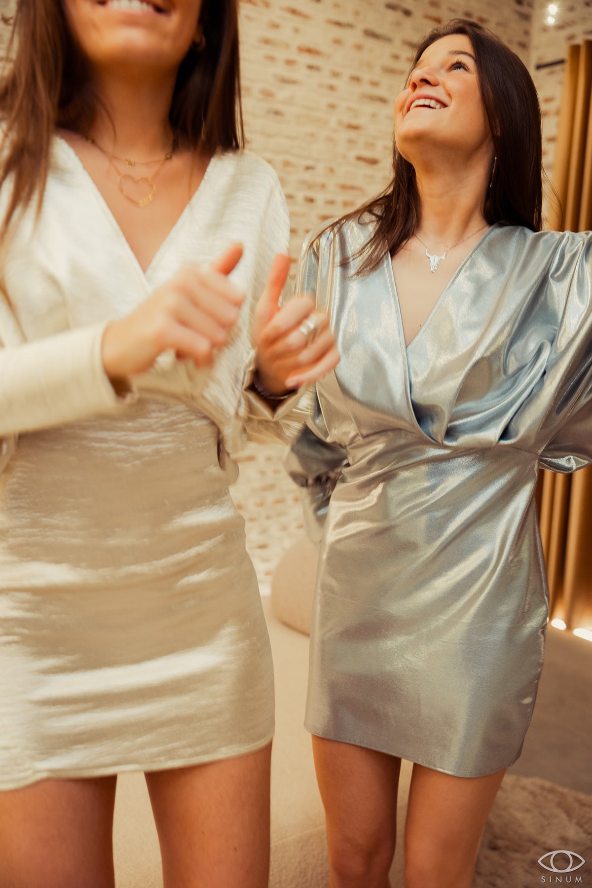 In silver, this metallic mini dress gives high-waist definition with a glossy, light-catching finish.
